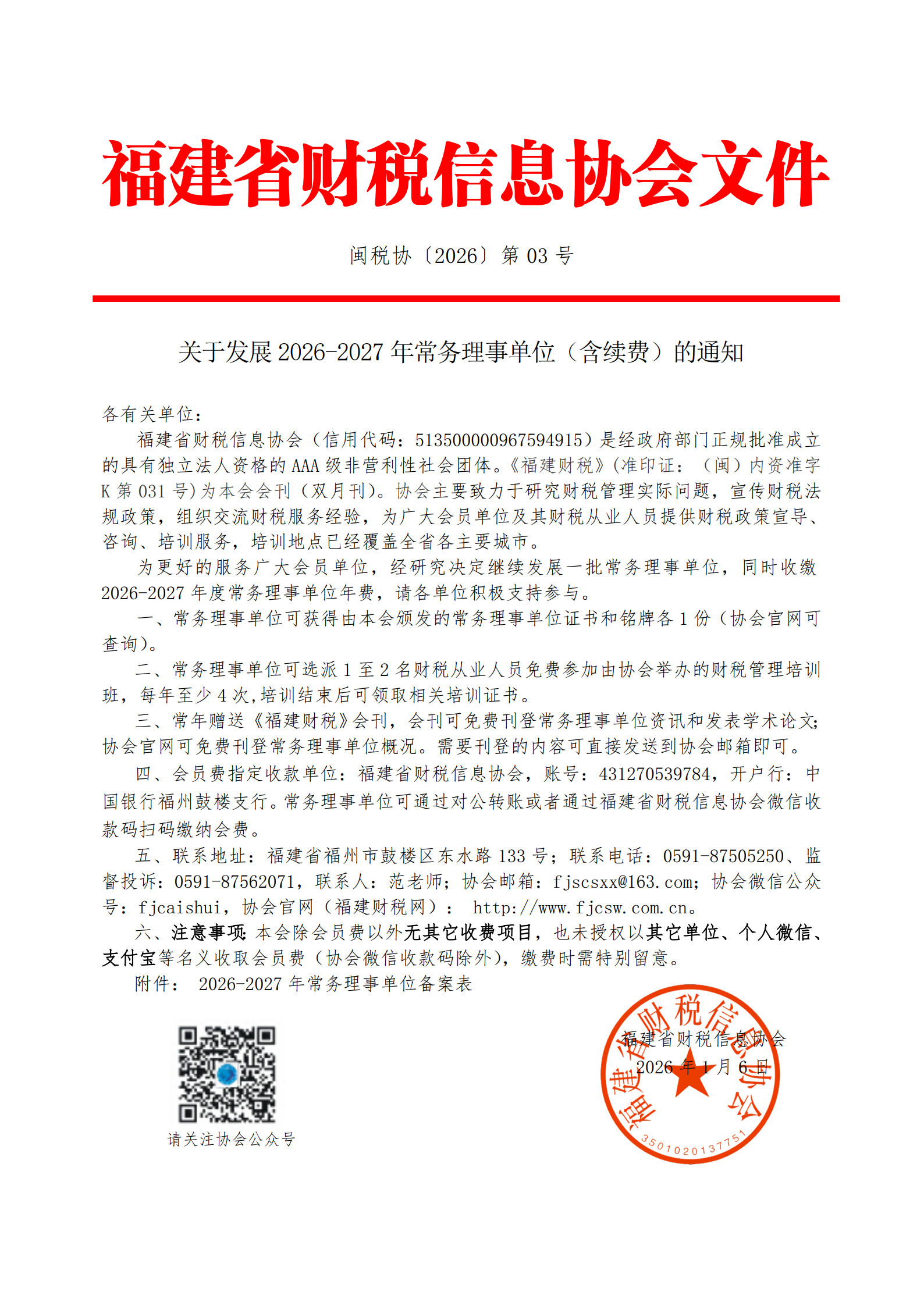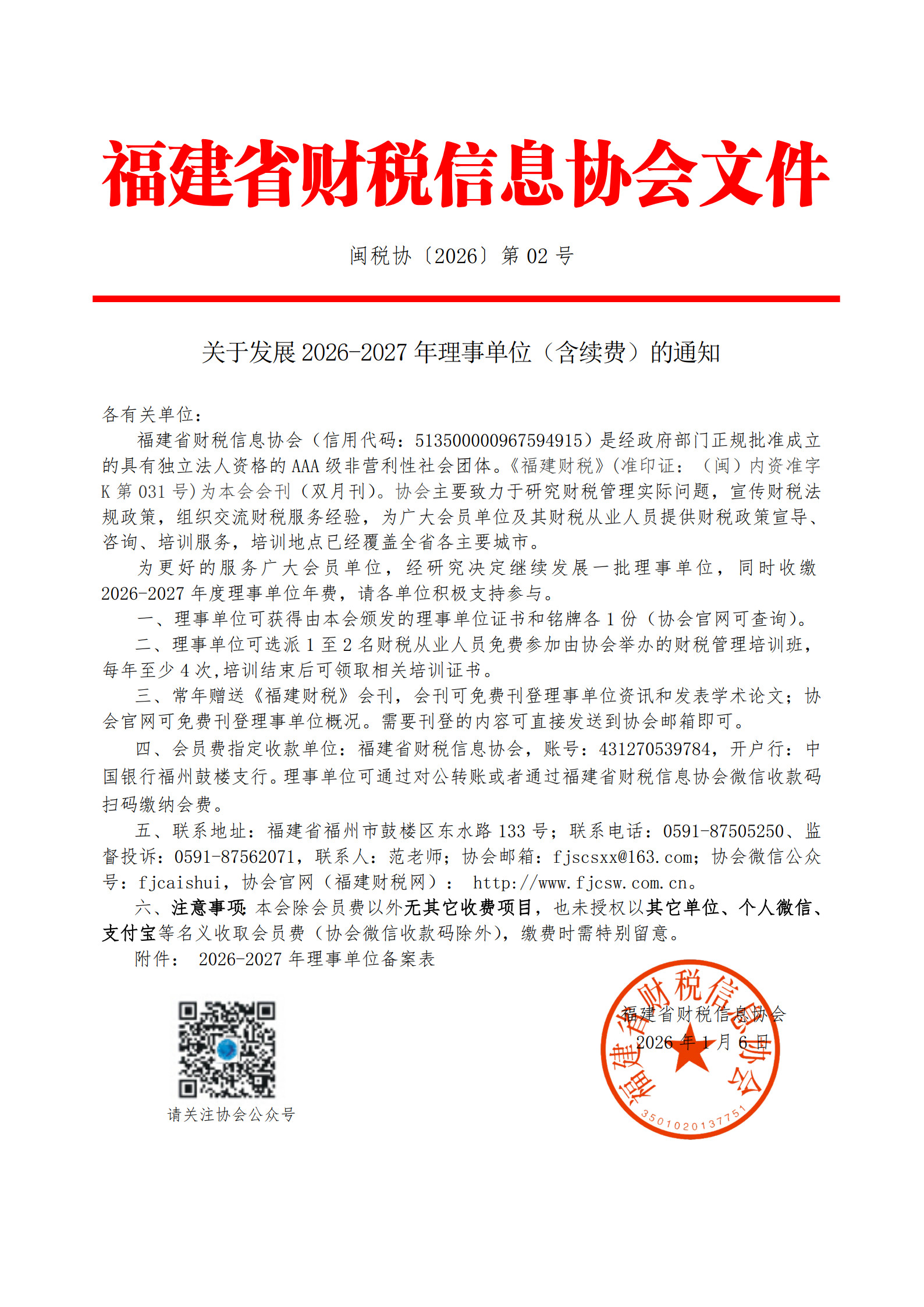 福建省財稅信息協(xié)會(信用代碼:513500000967594915)是經(jīng)政府部門正規(guī)批準(zhǔn)成立的具有獨立法人資格的AAA級非營利性社會團體?!陡=ㄘ敹悺?準(zhǔn)印證:(閩)內(nèi)資準(zhǔn)字K第031號)為本會會刊(雙月刊)。協(xié)會主要致力于研究財稅管理實際問題,宣傳財稅法規(guī)政策,組織交流財稅服務(wù)經(jīng)驗,為廣大會員單位及其財稅從業(yè)人員提供財稅政策宣導(dǎo)、咨詢、培訓(xùn)服務(wù), 為更好的服務(wù)廣大會員單位,經(jīng)研究決定繼續(xù)發(fā)展一批常務(wù)理事單位,同時收繳2026-2027年度常務(wù)理事單位年費,請各單位積極支持參與。