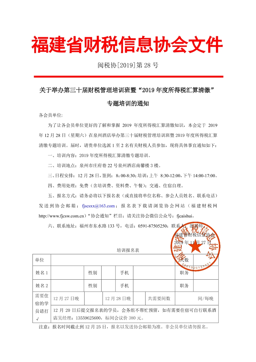為了讓各會員單位更好的了解和掌握2019年度所得稅匯算清繳知識,本會定于2019年12月28日(星期六)在泉州酒店舉辦第三十屆財稅管理培訓班暨2019年度所得稅匯算清繳專題培訓。