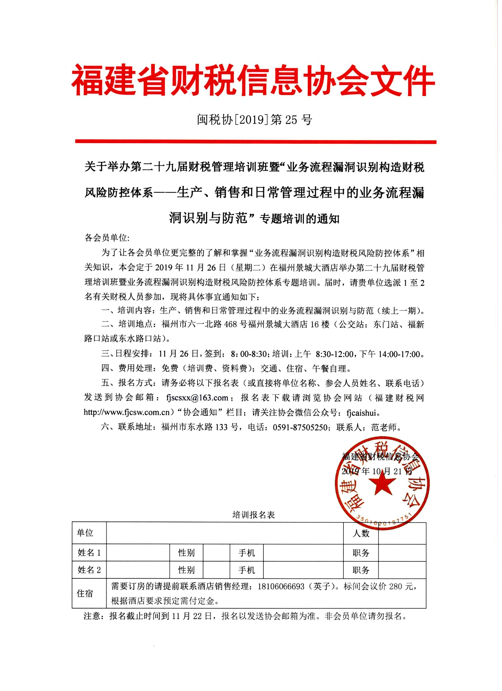 為了讓各會員單位更完整的了解和掌握“業(yè)務流程漏洞識別構(gòu)造財稅風險防控體系”相關知識,本會定于2019年11月26日(星期二)在福州景城大酒店舉辦第二十九屆財稅管理培訓班暨業(yè)務流程漏洞識別構(gòu)造財稅風險防控體系專題培訓。