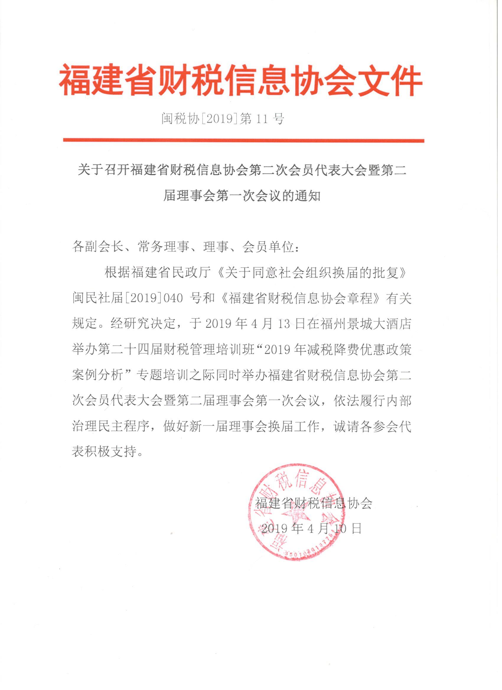 關(guān)于召開福建省財稅信息協(xié)會第二次會員代表大會暨第二屆理事會第一次會議的通知