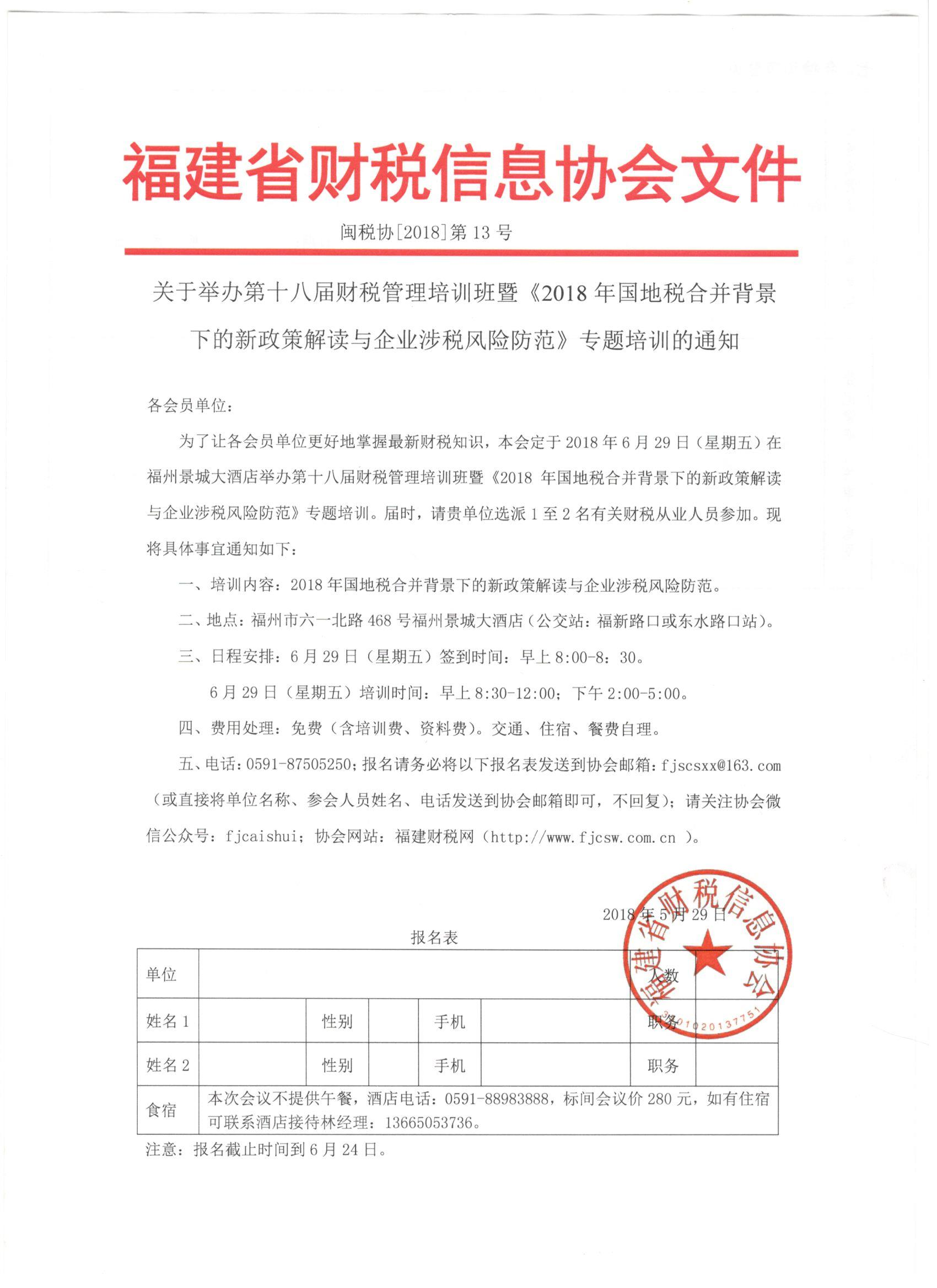 關(guān)于舉辦第十八屆財(cái)稅管理培訓(xùn)班暨《2018年國地稅合并背景下的新政策解讀與企業(yè)涉稅風(fēng)險(xiǎn)防范》專題培訓(xùn)的通知