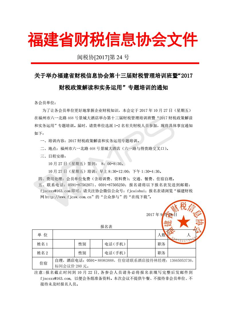 為了讓各會(huì)員單位更好地掌握企業(yè)財(cái)稅知識(shí),本會(huì)定于2017年10月27日(星期五)在福州市六一北路468號(hào)景城大酒店舉辦第十三屆財(cái)稅管理培訓(xùn)班暨“2017財(cái)稅政策解讀和實(shí)務(wù)運(yùn)用”專題培訓(xùn)。