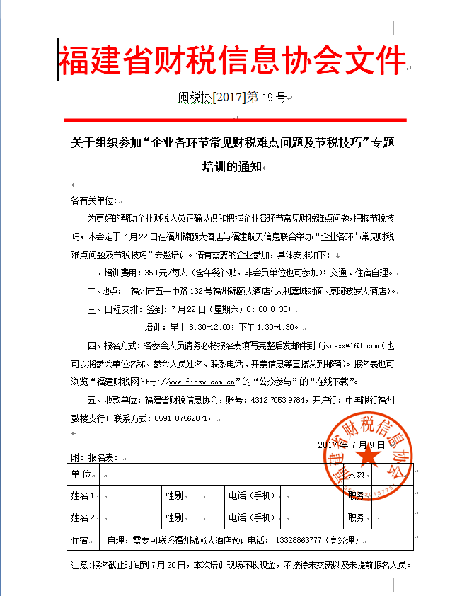 為更好的幫助企業(yè)財(cái)稅人員正確認(rèn)識(shí)和把握企業(yè)各環(huán)節(jié)常見財(cái)稅難點(diǎn)問題,把握節(jié)稅技巧,本會(huì)定于7月22日在福州錦頤大酒店與福建航天信息聯(lián)合舉辦“企業(yè)各環(huán)節(jié)常見財(cái)稅難點(diǎn)問題及節(jié)稅技巧”專題培訓(xùn)。