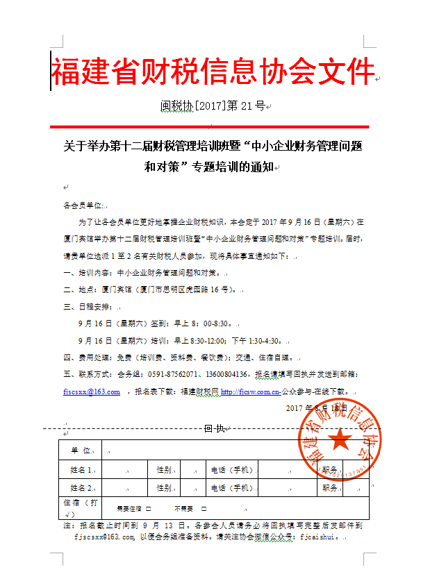 為了讓各會(huì)員單位更好地掌握企業(yè)財(cái)稅知識(shí),本會(huì)定于2017年9月16日(星期六)在廈門賓館舉辦第十二屆財(cái)稅管理培訓(xùn)班暨“中小企業(yè)財(cái)務(wù)管理問題和對策”專題培訓(xùn)。