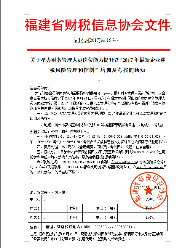 關(guān)于舉辦財(cái)務(wù)管理人員崗位能力提升暨“2017年最新企業(yè)涉稅風(fēng)險(xiǎn)管理和控制”培訓(xùn)及考核的通知