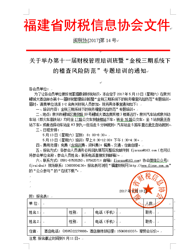 為了讓各會(huì)員單位更好地掌握最新財(cái)稅知識(shí),本會(huì)定于2017年5月13日(星期六)在泉州鯉城大酒店舉辦第十一屆財(cái)稅管理培訓(xùn)班暨“金稅三期系統(tǒng)下的稅務(wù)稽查風(fēng)險(xiǎn)防范”專題培訓(xùn)。