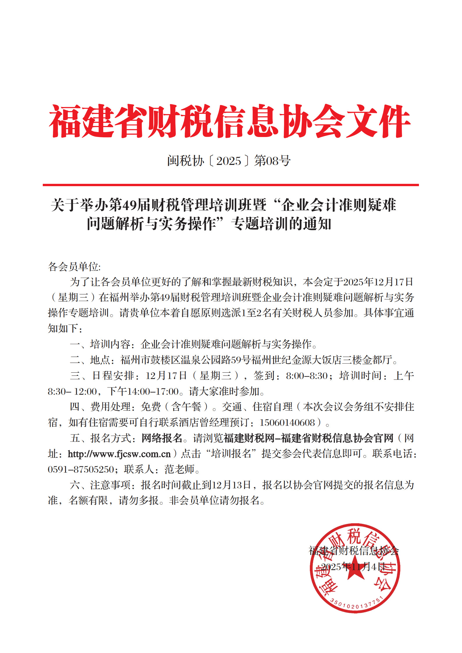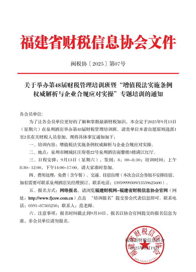 為了讓各會員單位更好的了解和掌握最新財稅知識,本會定于2025年12月17日(星期三)在福州舉辦第49屆財稅管理培訓(xùn)班暨企業(yè)會計準則疑難問題解析與實務(wù)操作專題培訓(xùn),請貴單位本著自愿原則選派1至2名有關(guān)財稅人員參加。