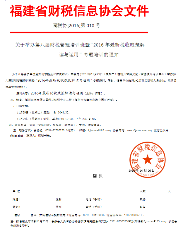 為了讓各會員單位更好地掌握企業(yè)財稅知識,本會定于2016年11月29日(星期二)在福州左海大廈(省國稅局培訓(xùn)中心)舉辦第八屆財稅管理培訓(xùn)班暨“2016年最新稅收政策解讀與運用”專題培訓(xùn)。