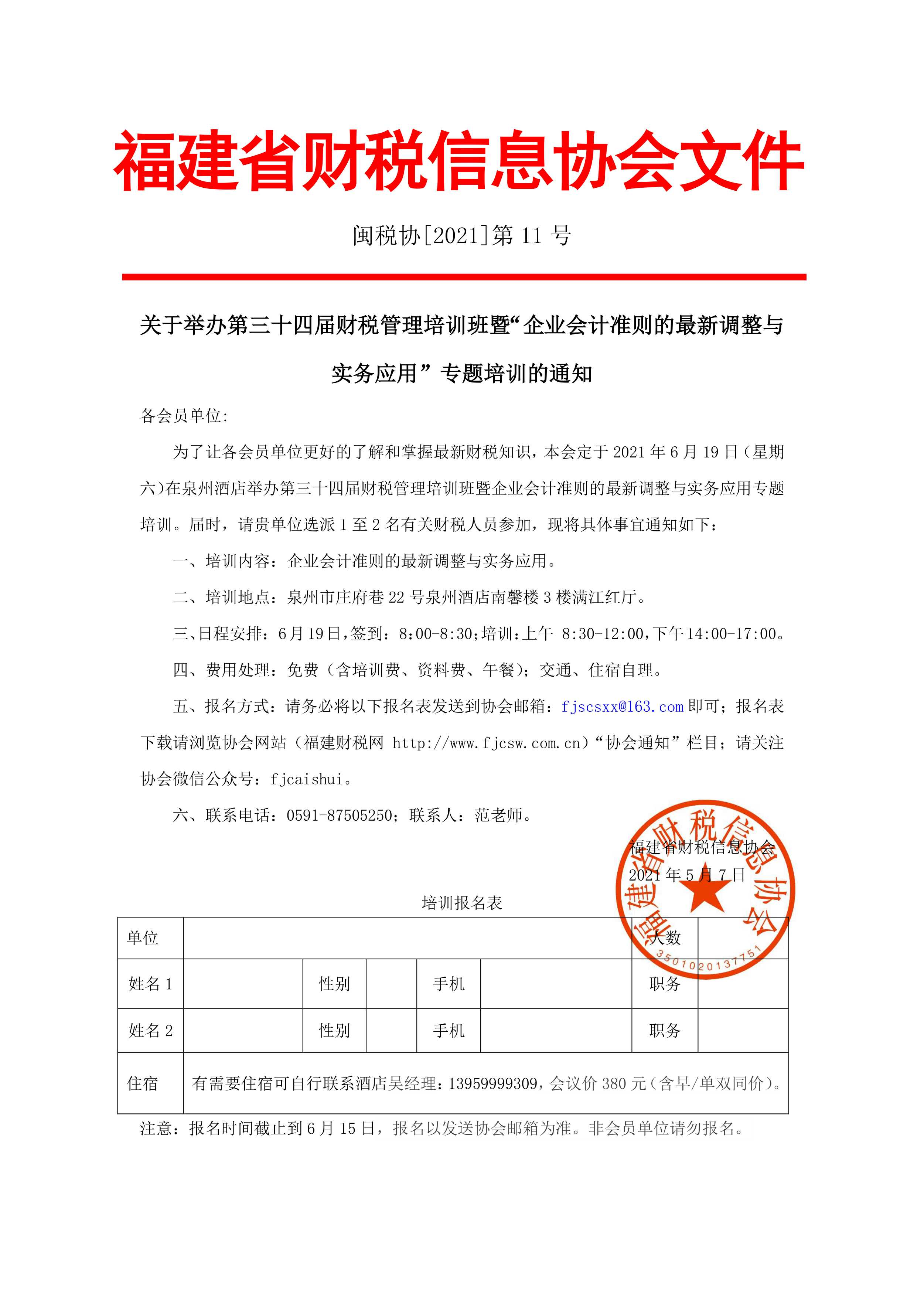 關(guān)于舉辦第三十四屆財稅管理培訓班暨“企業(yè)會計準則的最新調(diào)整與實務應用”專題培訓的通知