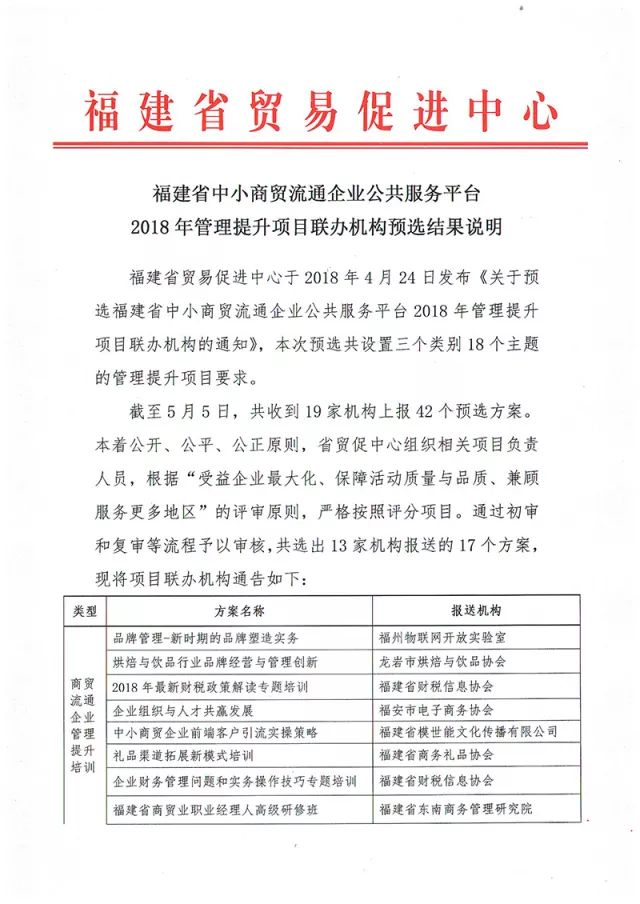 2018年5月31日上午,2018年福建省中小商貿流通企業(yè)管理提升項目聯辦機構工作會議在福建省商務廳3號樓貿易促進中心舉辦。