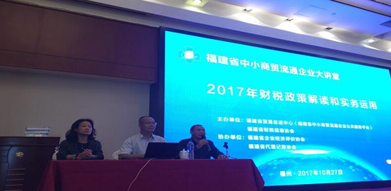 2017年10月27日,由福建省財稅信息協(xié)會與福建省貿(mào)易促進中心(福建省中小商貿(mào)流通企業(yè)公共服務平臺)共同主辦,福建省代理記賬協(xié)會等兄弟單位協(xié)辦的福建省中小商貿(mào)流通企業(yè)大講堂暨《2017年財稅政策解讀和實務運用》專題講座(福建省財稅信息協(xié)會第十三屆財稅管理培訓班)在福州景城大酒店成功舉辦。